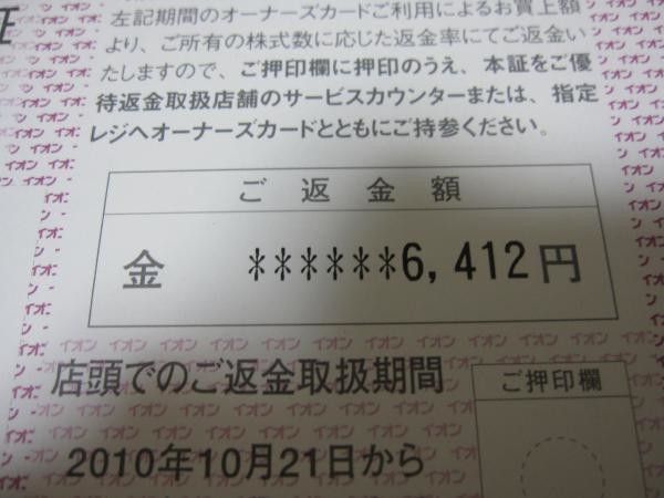 イオンの株主優待は「イオン株を持っていると、オーナーズカードがもらえ、イオン内のラウンジでタダ茶できたり、お買い上げ金額の数パーセントが返金されます。」という、イオンでよくお買い物する方なら絶対お得な内容です。この時は半年で6412円の返金、年間で13319円。かなり嬉しい臨時収入です!