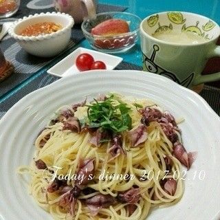 下のパスタはホタルイカのパスタ。たまごスープ、りんご、プチトマトなど入れても1食200円!