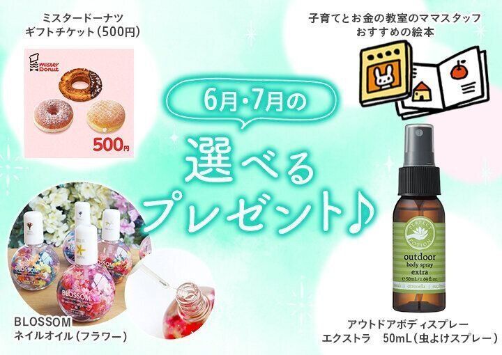 6月・7月は、ミスタードーナツ ギフトチケット(500円)、BLOSSOM ネイルオイル(フラワー)、アウトドアボディスプレー エクストラ 50mL(虫よけスプレー)、子育てとお金の教室のママスタッフおすすめの絵本から選べます。