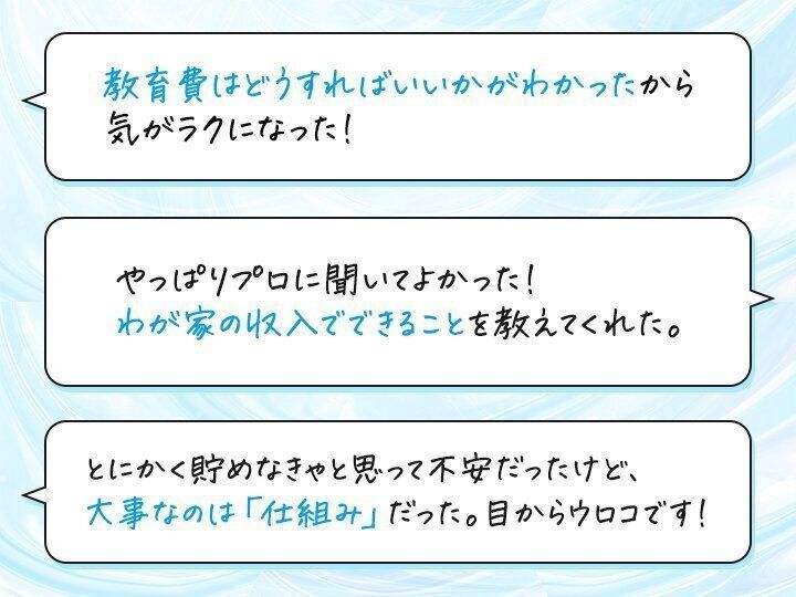 講師は全員が生命保険・金融プロフェッショナルの組織「MDRT」の会員資格を持つファイナンシャルプランナー。信頼と実績のあるお金のプロ中のプロだから、教育費も老後資金も必要なときに必要な額が準備できる『仕組み』作りが可能に。『仕組み』さえ作れば、教育費のことも老後資金のことも考えなくていいんです。これはラク!