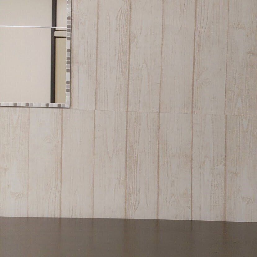 壁面に白木の柄のリメークシートを貼り、イメチェンをしてみました。