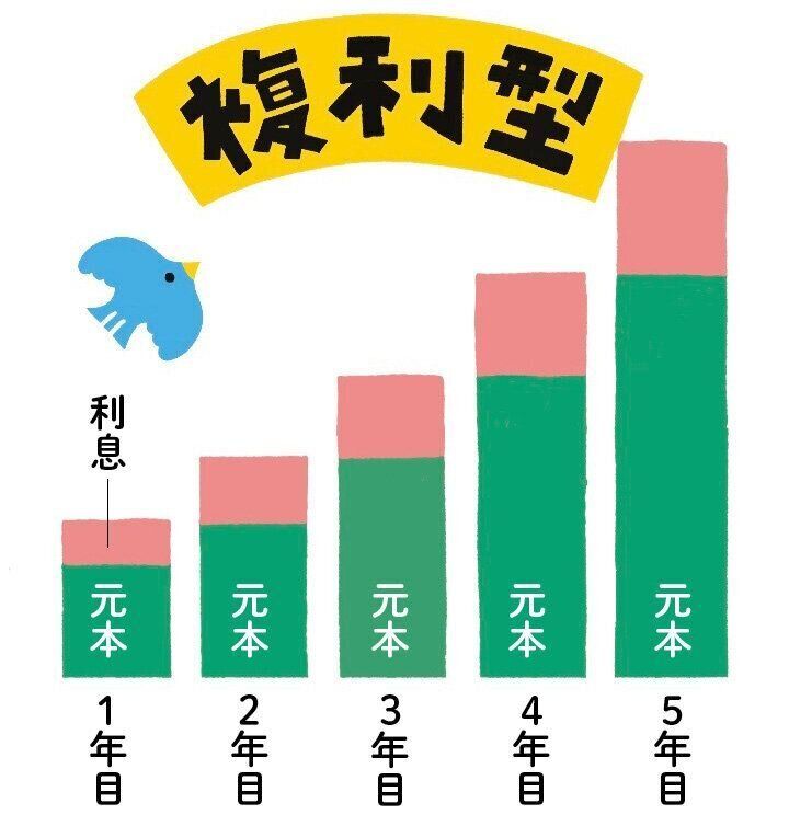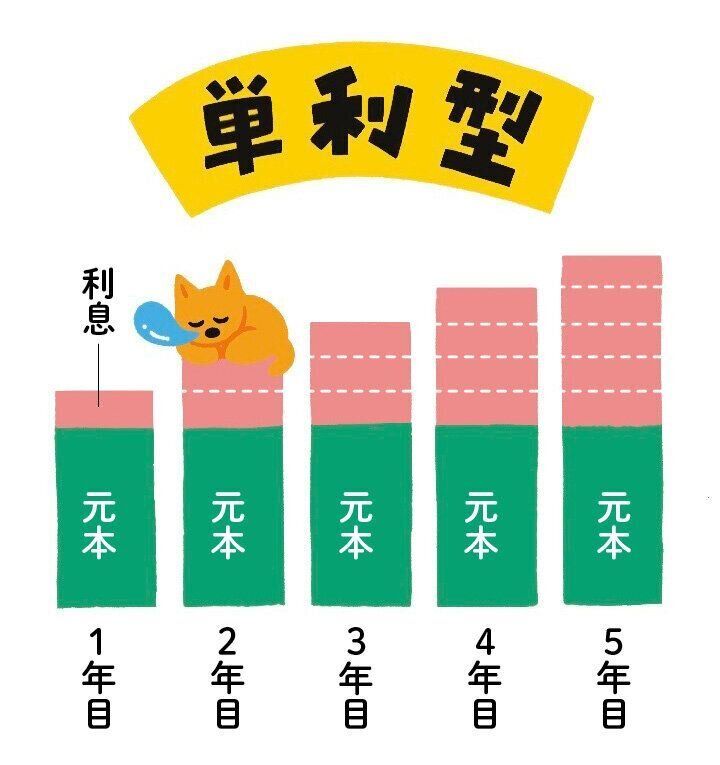 先ほどのバブル期の定期預金は、複利型なら10年後に100万円がおよそ179万円にもなったんですよ(税引き前)。金融商品の運用方法には「単利」と「複利」の2種類あり、単利型は当初の元本に利息がつくだけの運用、複利型はそれまでについた利息も含めて再運用し、利息が計算されるもののことです。複利型はよく、“利息に利息がつく”とか“雪だるま式に増える”と表現されますよね。