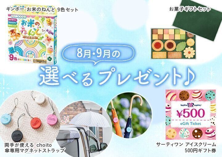 8月・9月は、サーティワン アイスクリーム 500円ギフト券、ギンポー お米のねんど(9色セット)、両手が使える choito 傘専用マグネットストラップ、お菓子ギフトセットから選べます。