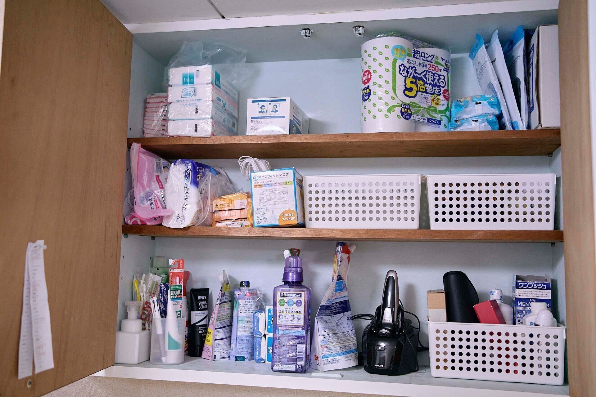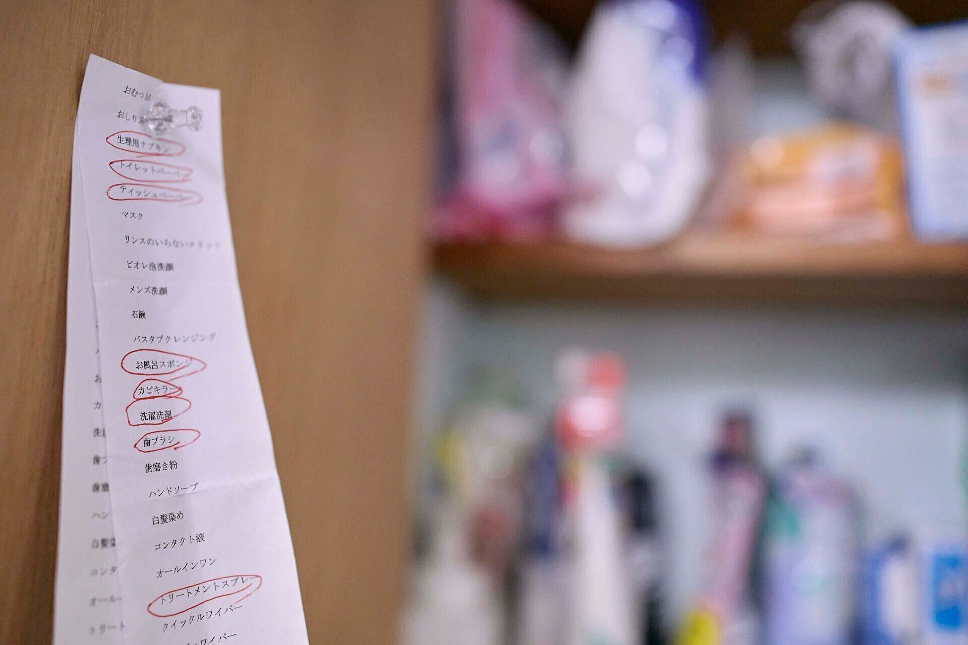 次に、見せてもらったのは、洗面所の棚。日用品はここにまとめて収納して、在庫管理はオリジナルリストで行っています。