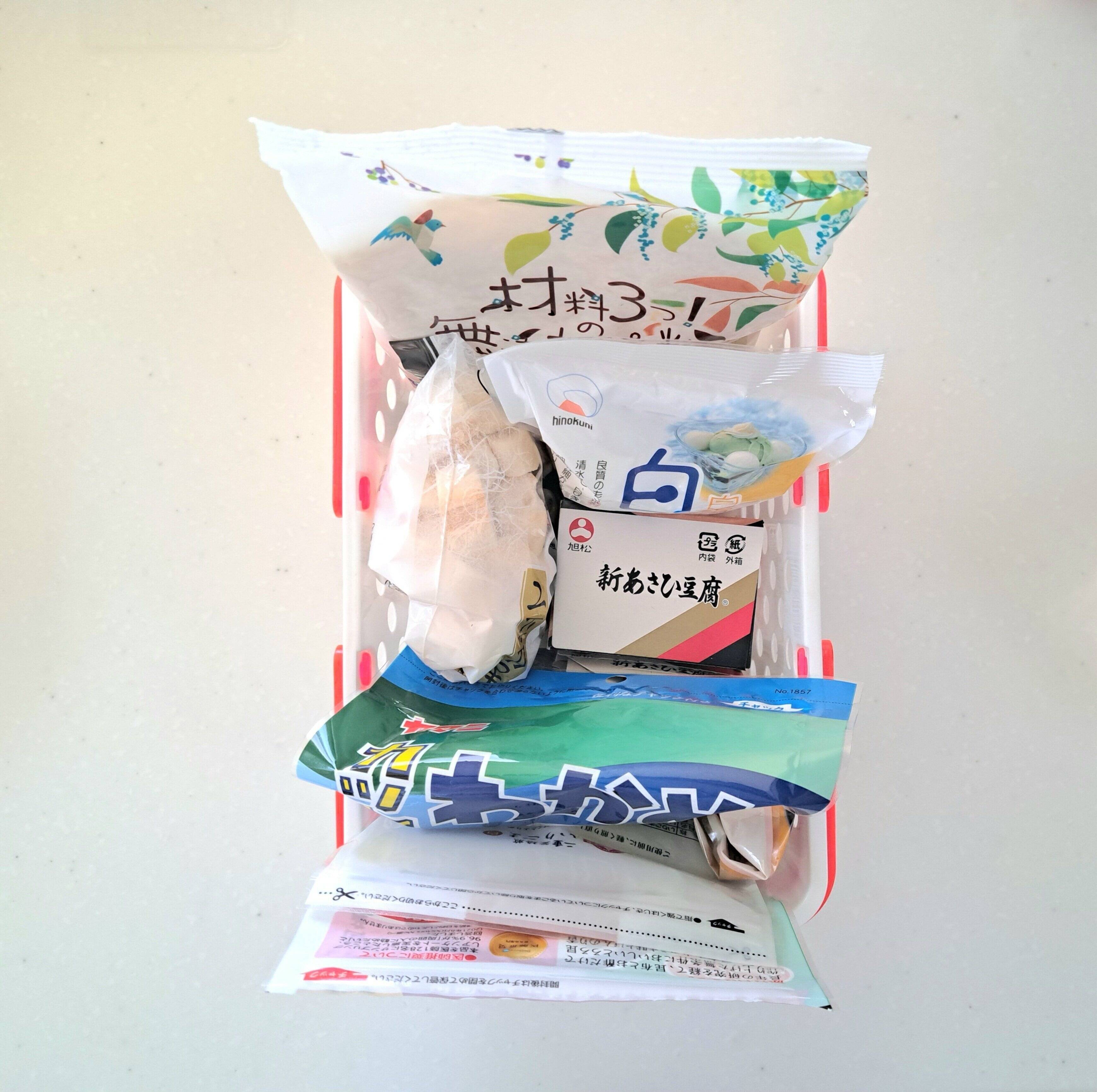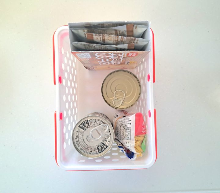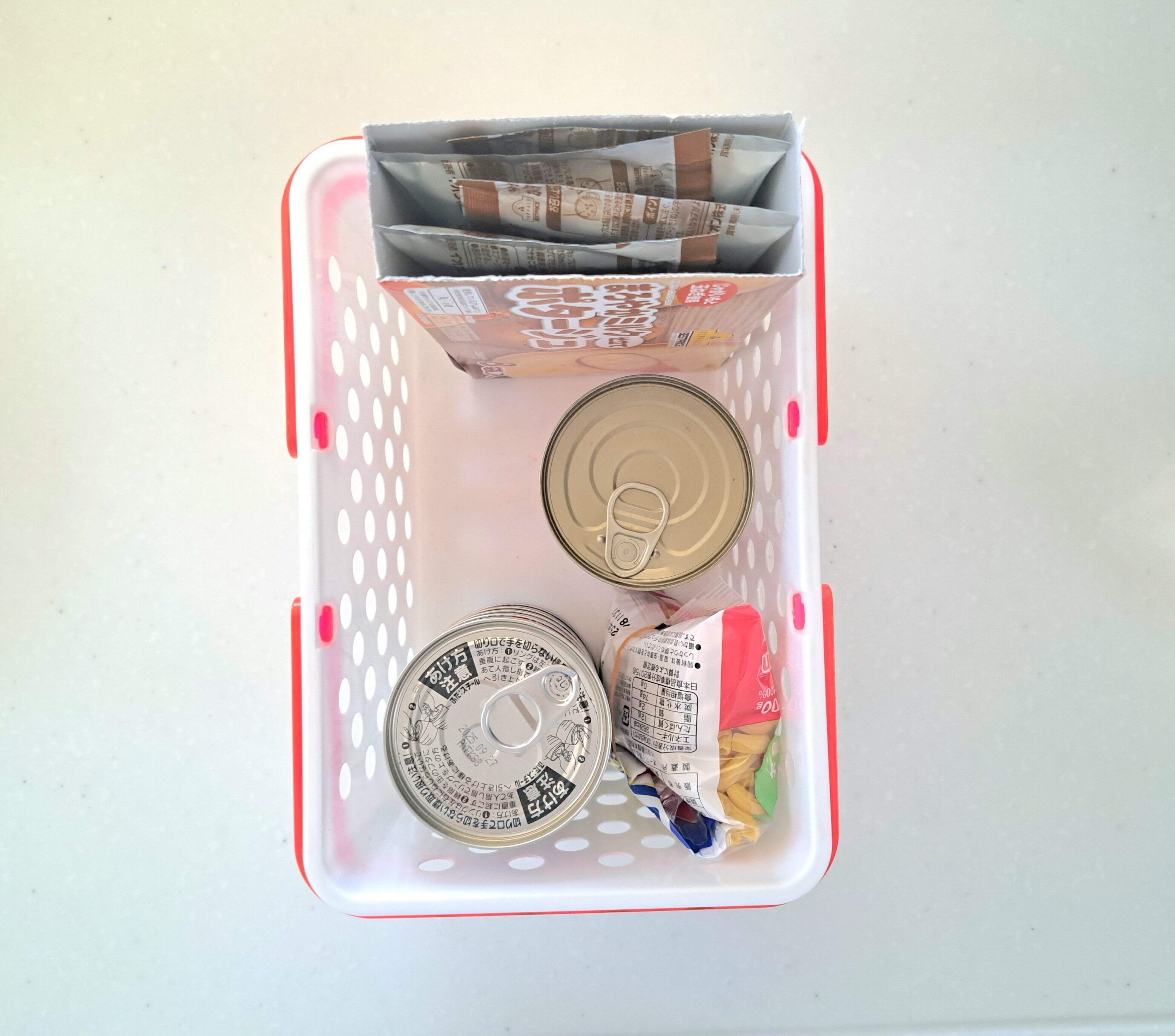 このかごにはツナ缶、トマト缶、パスタの素、ポタージュ、マカロニを入れています。