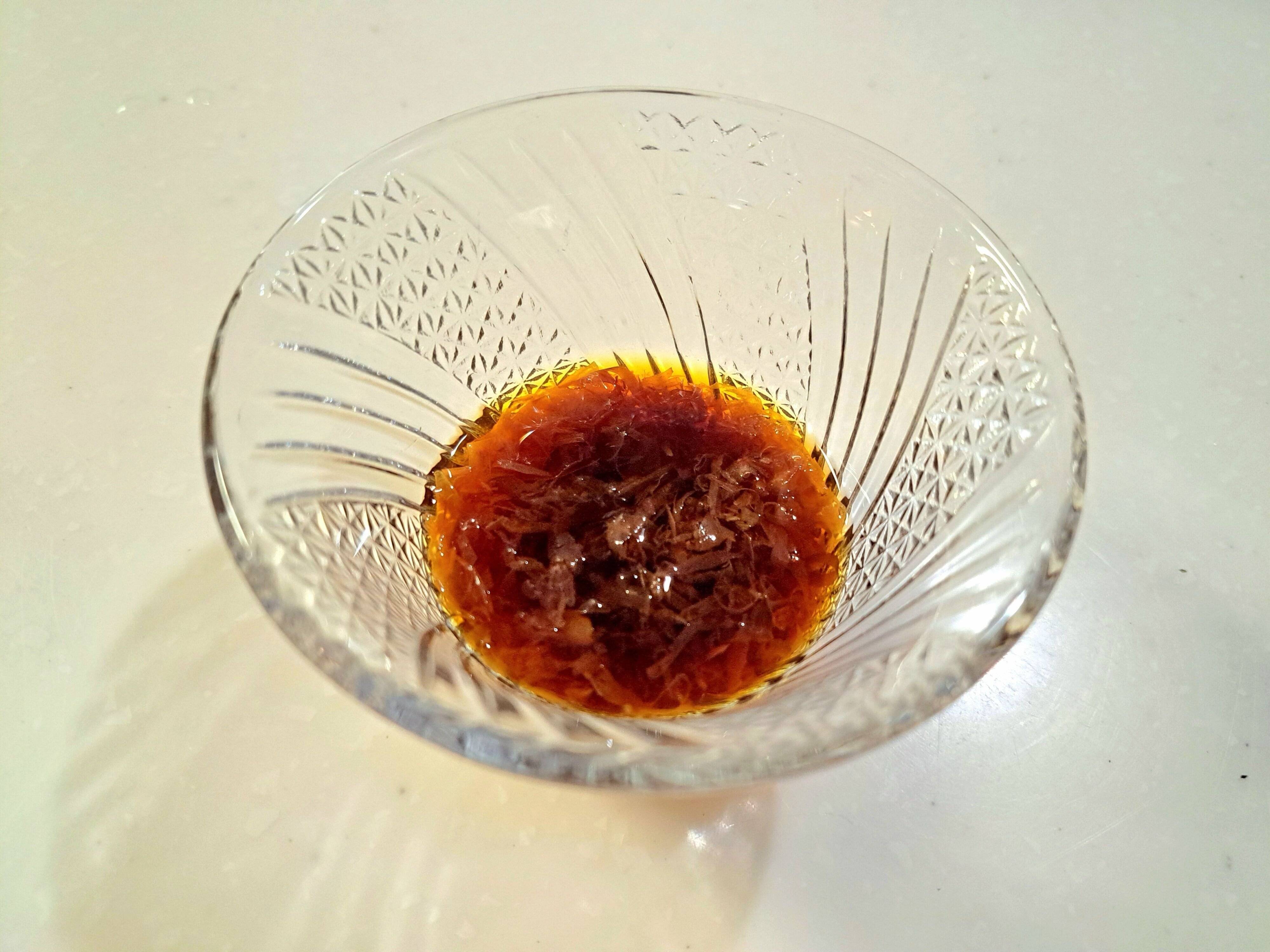 耐熱容器にしょうゆとみりんを入れて600Wのレンジで1分30秒加熱したら、かつおぶしを入れて完成です。