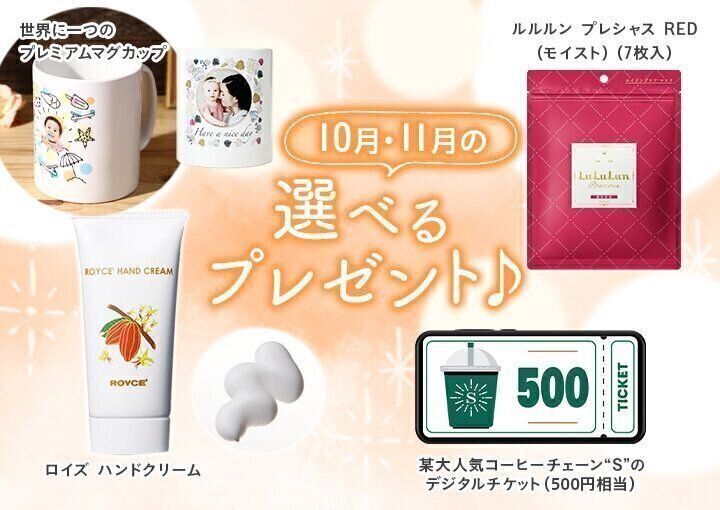 9月は、サーティワン アイスクリーム 500円ギフト券、ギンポー お米のねんど(9色セット)、両手が使える choito 傘専用マグネットストラップ、お菓子ギフトセットから。10月・11月は、大人気コーヒーチェーン"S"のデジタルチケット(500円相当)、ルルルン プレシャス、ロイズのハンドクリーム、好きな写真がプリントできるマグカップから選べます。