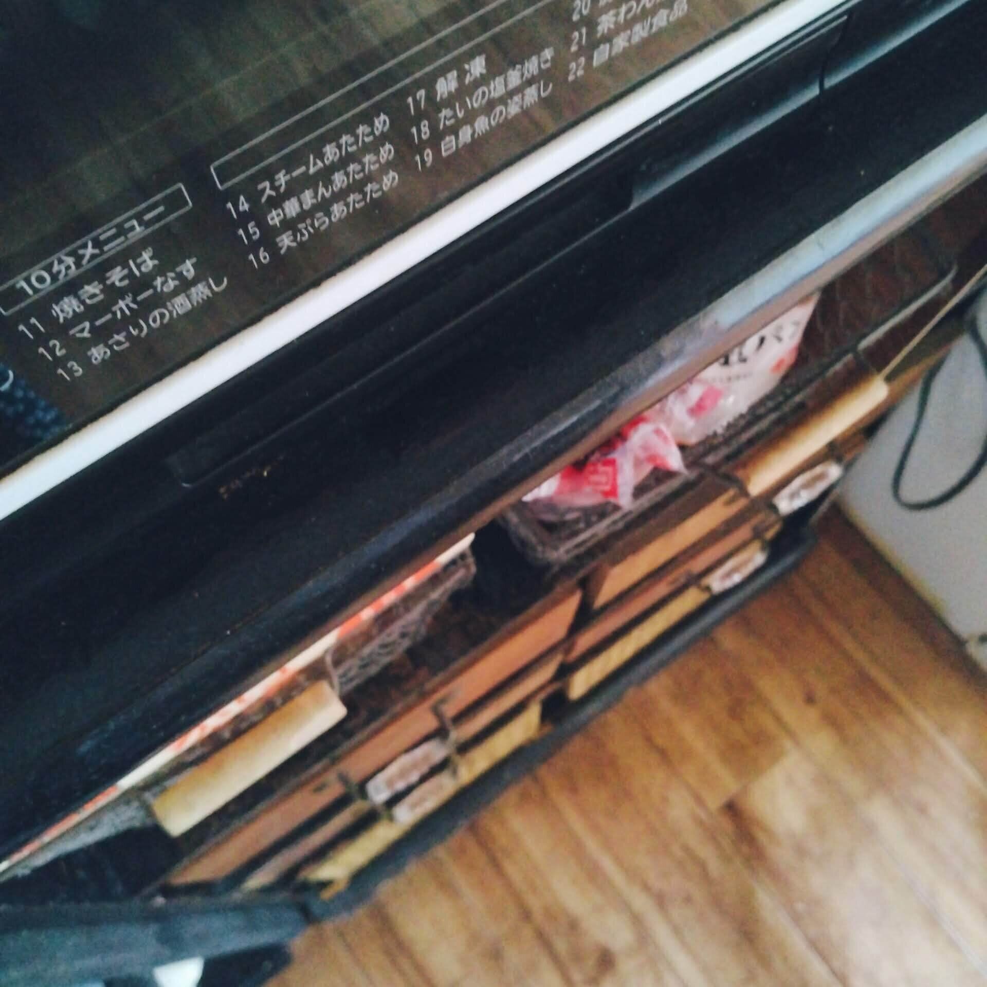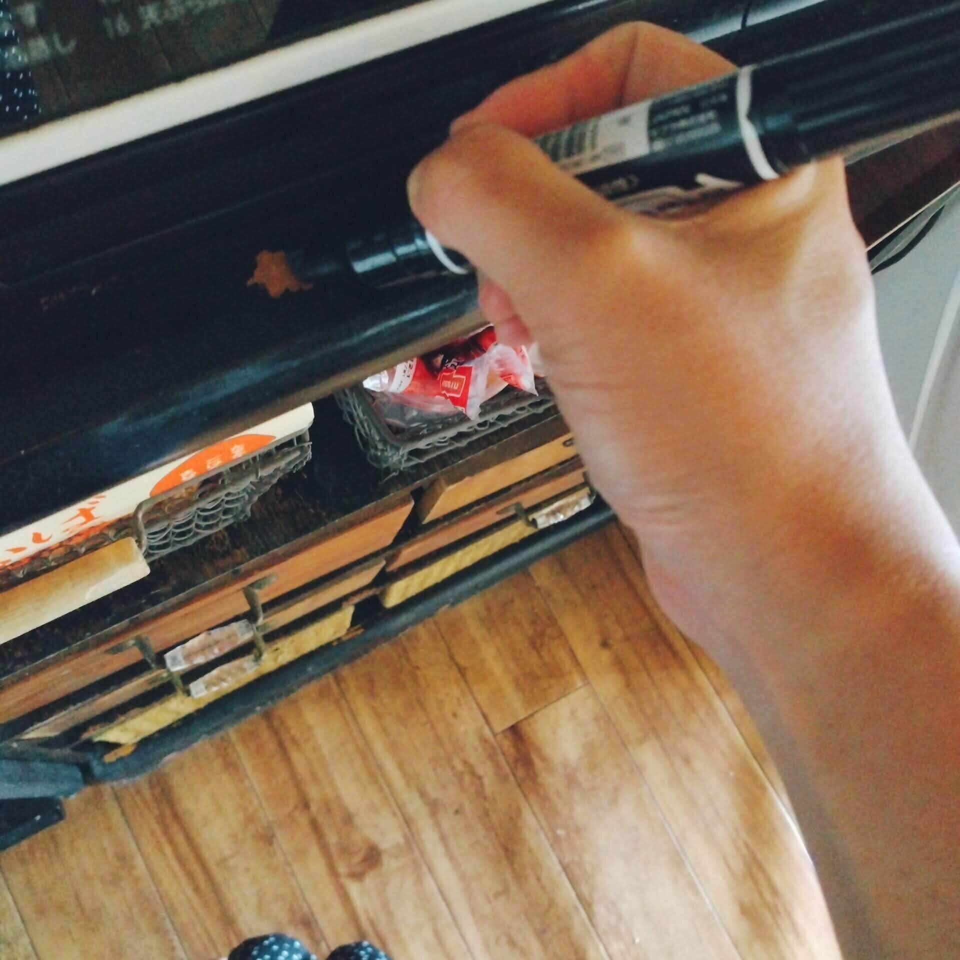 10年以上使っている電子レンジ台。経年劣化で塗装が剥がれてきたので、油性ペンでハゲ隠し。所要時間は約30秒。