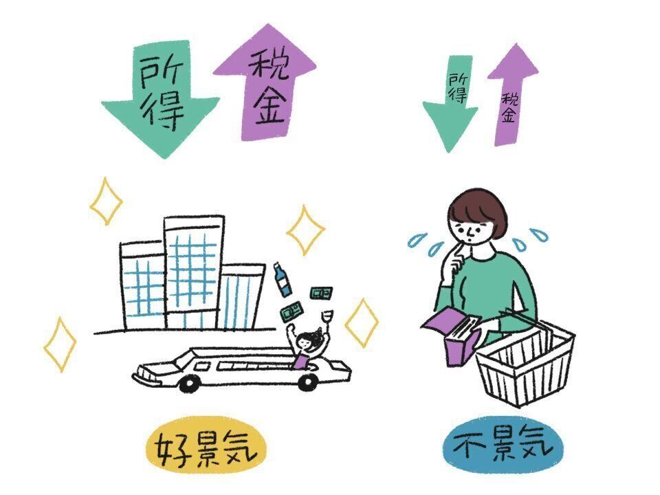 景気がよいときは所得が増え、それにともなって税収が増加。不況になると所得が減り、税収も減少。これによって民間需要(国民の消費支出や企業の設備投資など)が自動的に調整されるという、景気の調整弁としての役割を担っている。