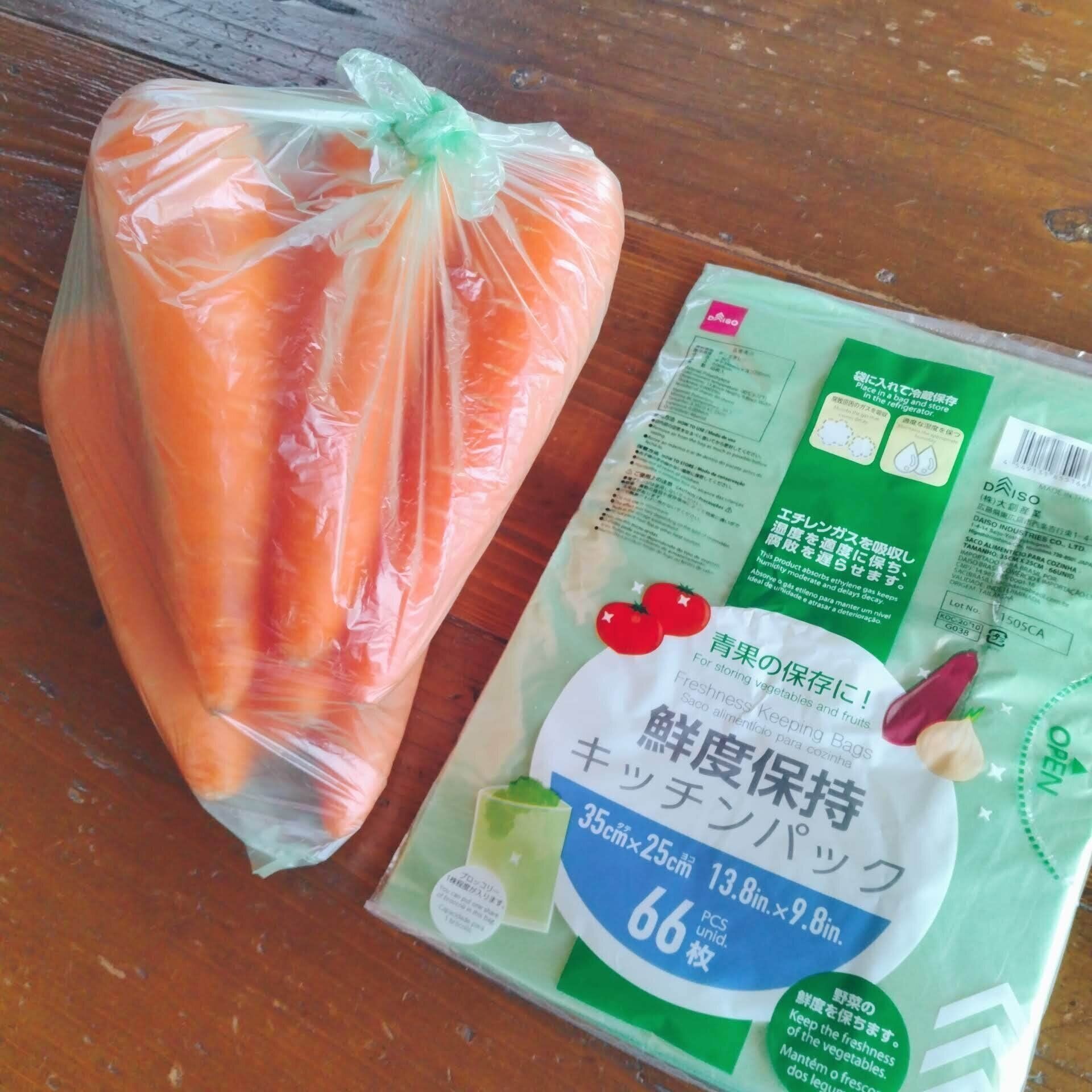 にんじんは、葉物野菜に比べると長持ちする根菜ですが、鮮度を長持ちさせるためダイソーの鮮度保持袋に入れて野菜室に入れています。