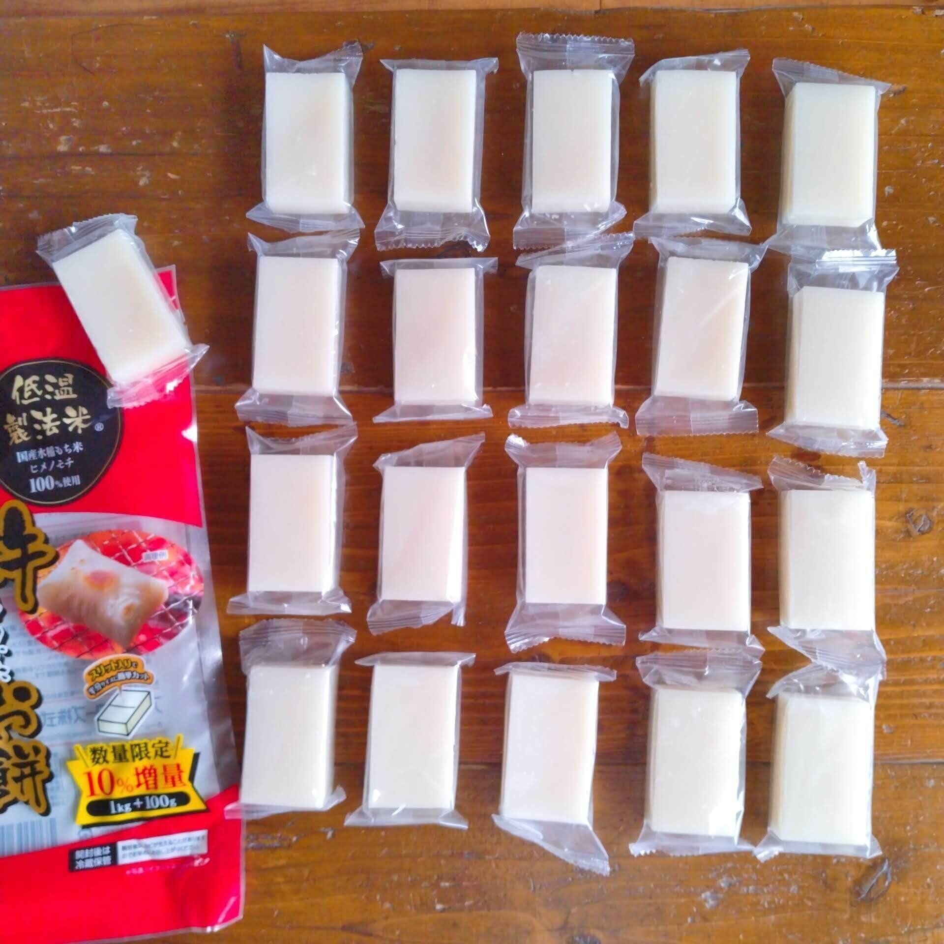 ドン・キホーテで購入した角餅は、1kgプラス100g増量パックの商品で、21個入って537円。1個あたりの金額は約26円です。