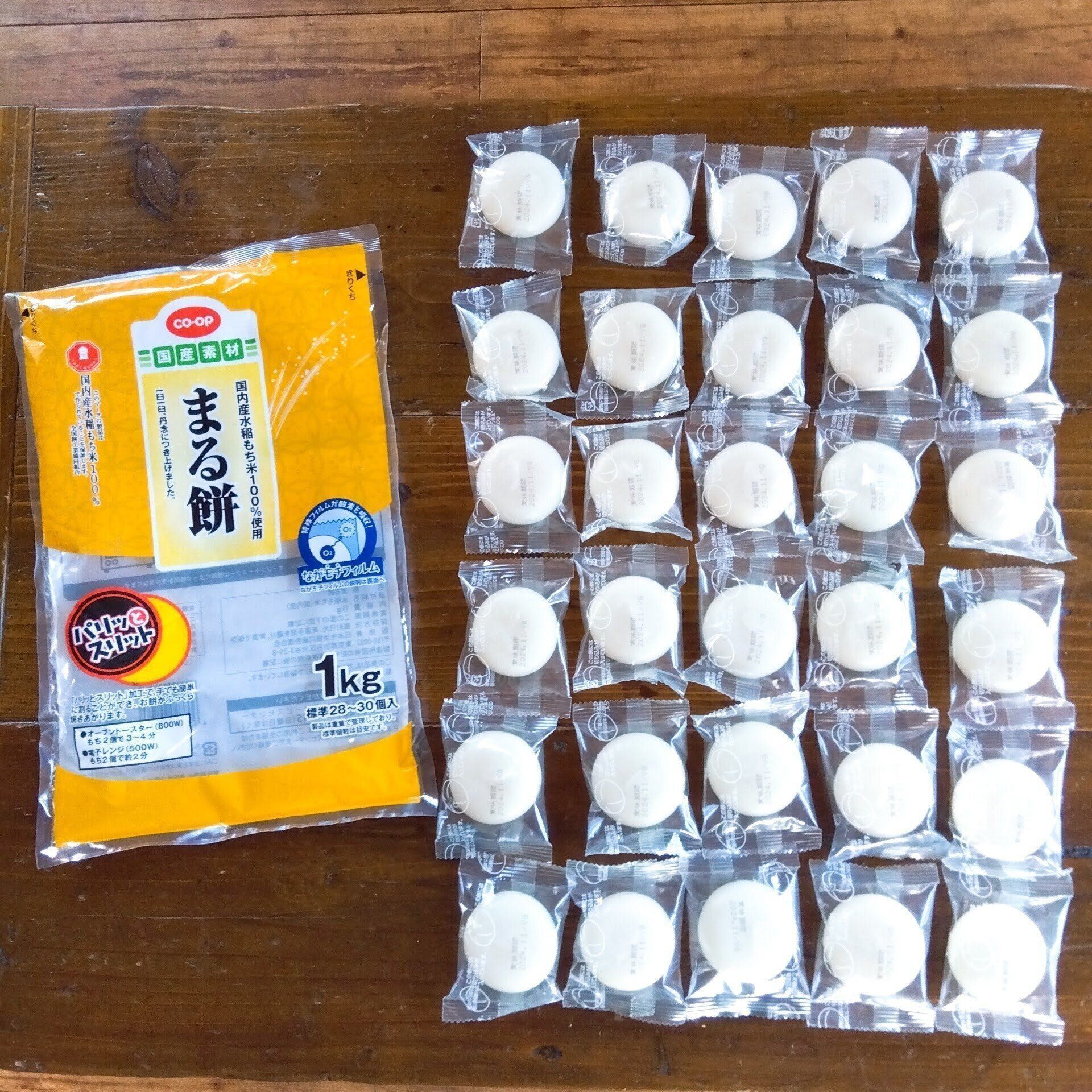 コープで買った「まる餅」は1kg28個から30個入りで699円。わたしが購入した商品には、お餅が30個入っていたので、1個あたりの金額は約23円です。