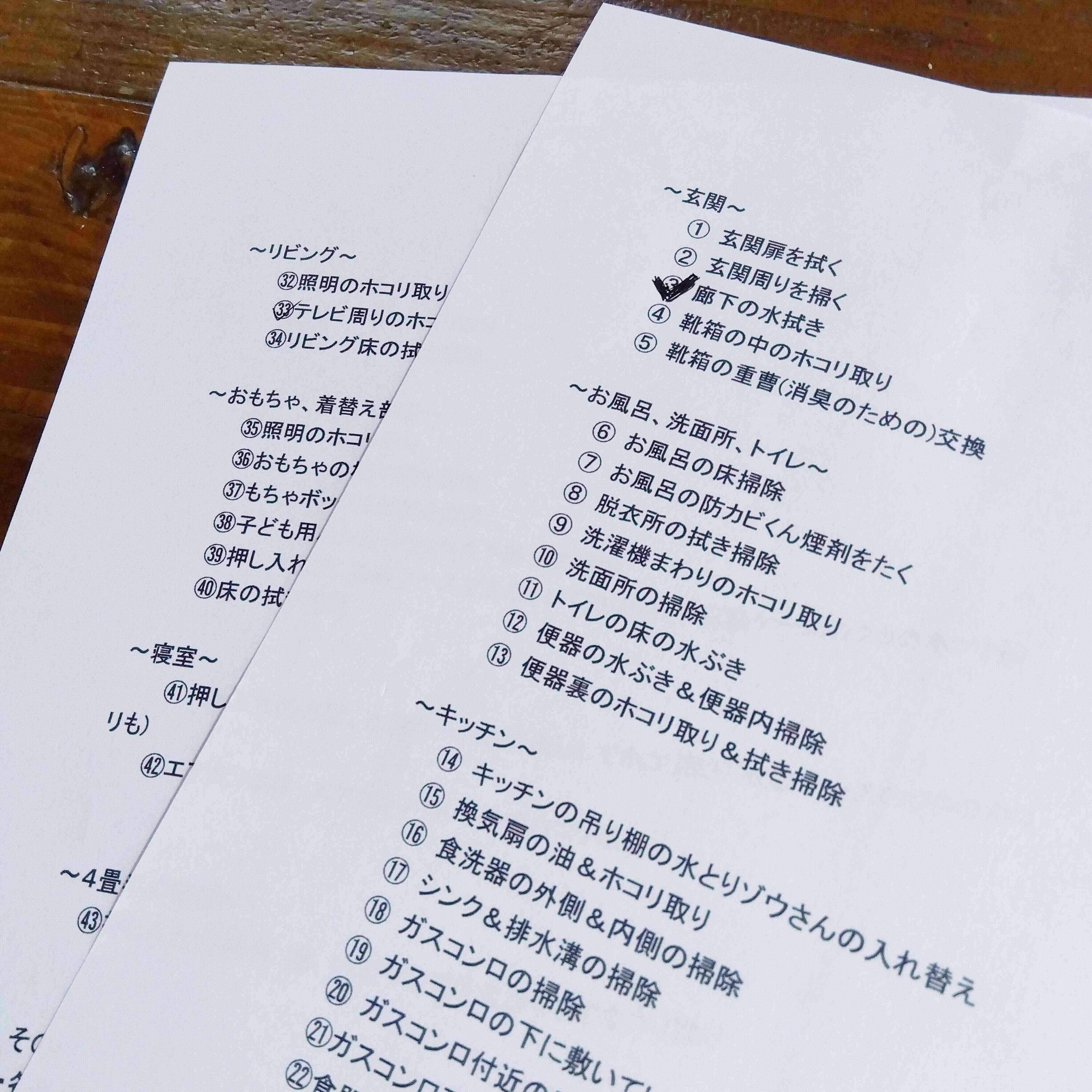大掃除の一覧表を印刷し毎日少しずつ掃除をすすめ、終わった場所にチェックを入れます。