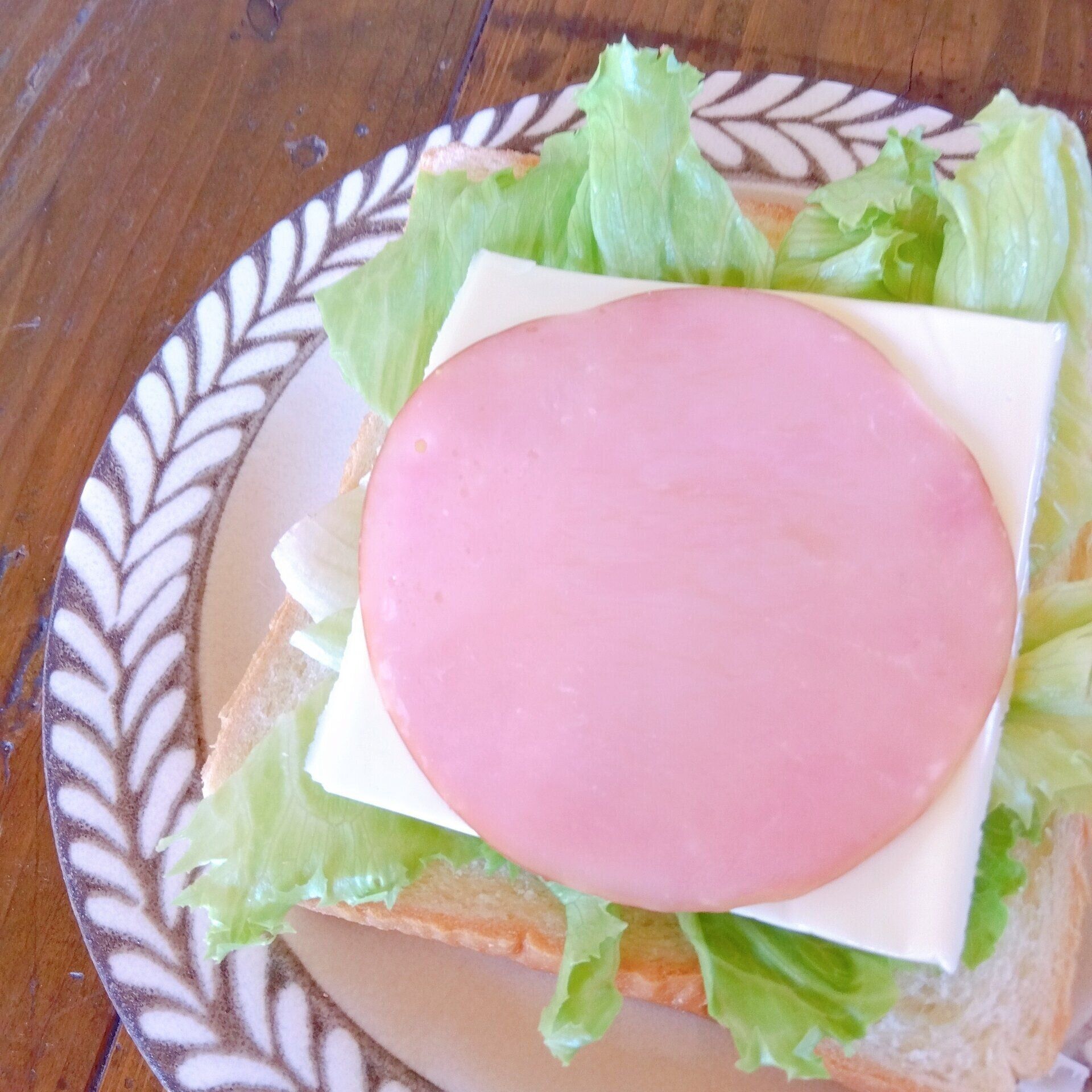 食パンの上に、マヨネーズ、レタス、チーズ、「ロースハム」の順で重ねる。