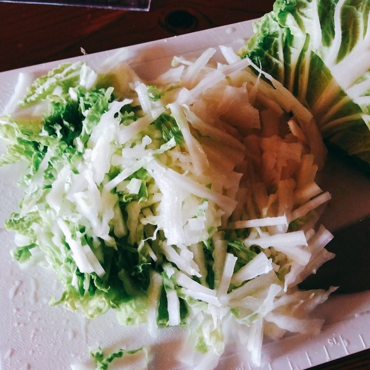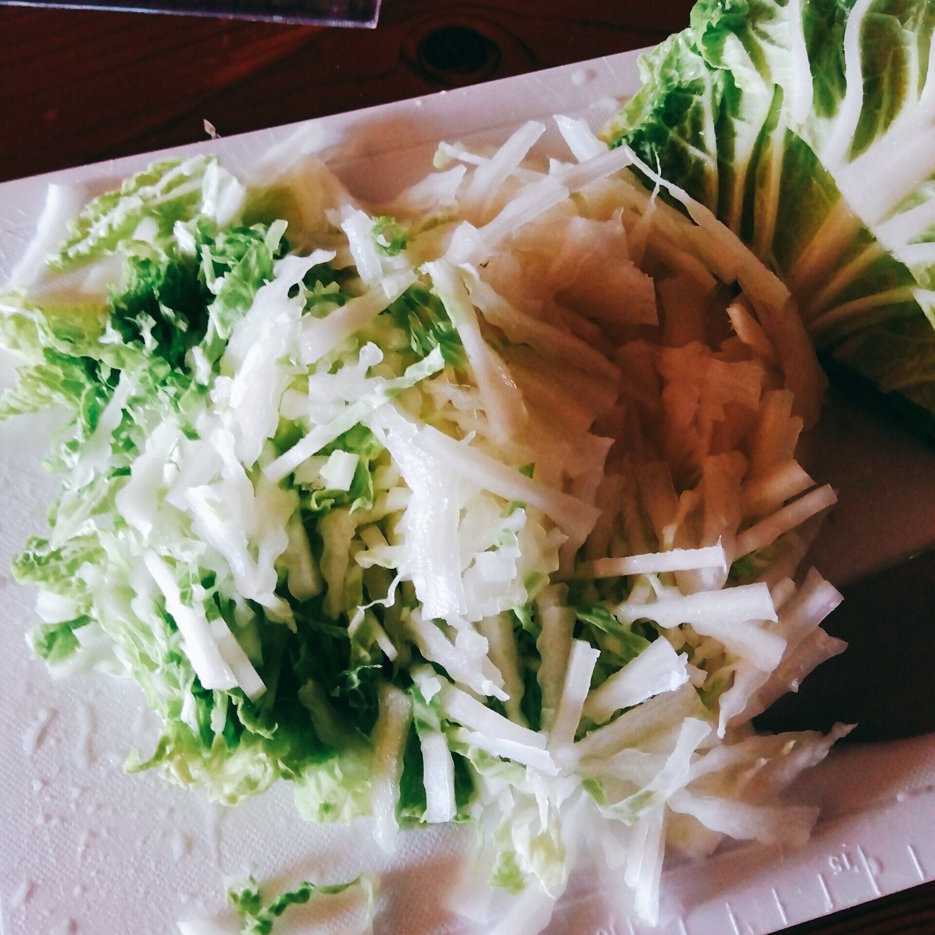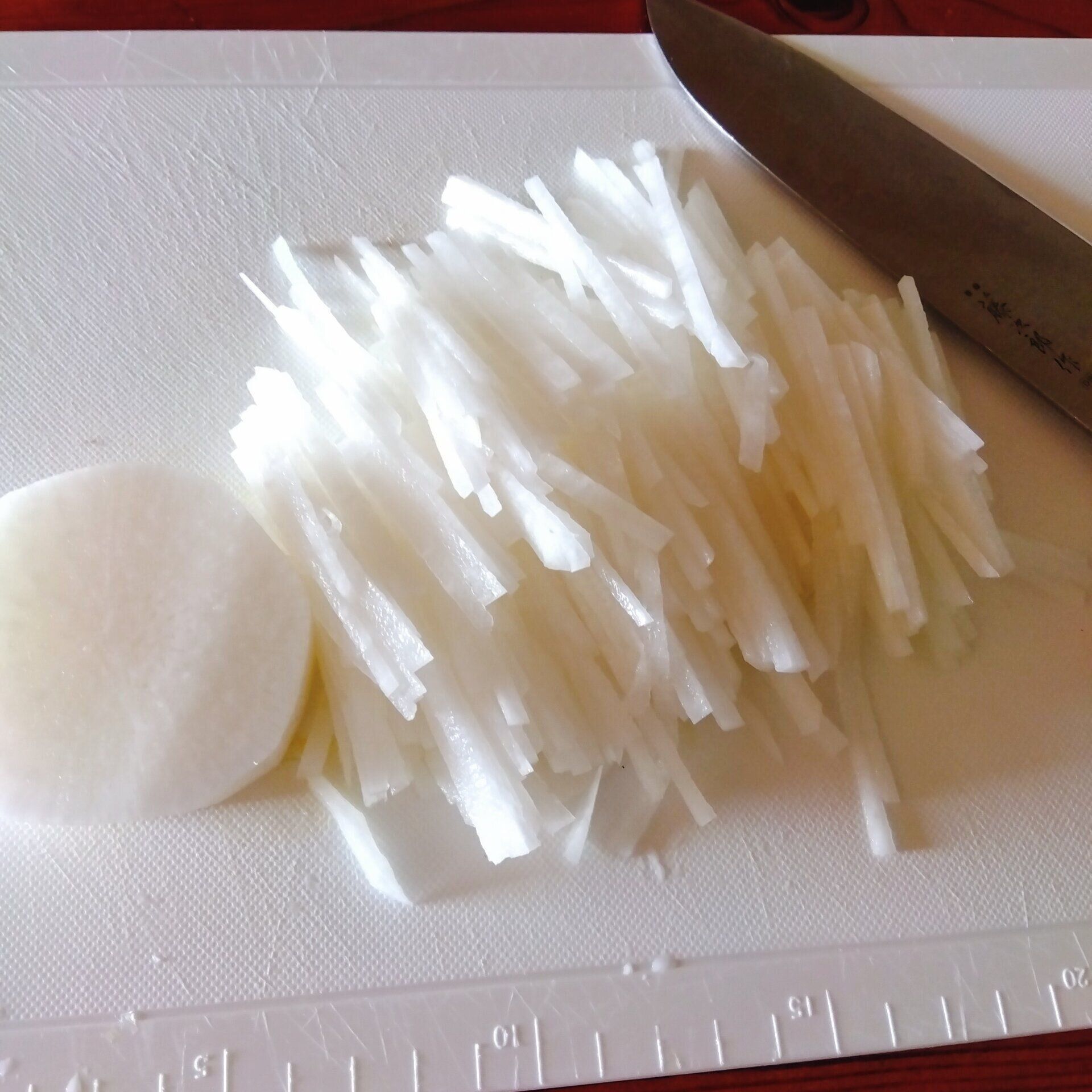 火の通りにくい大根も「千切り」にカットしています。白菜と同じで、全部をカットしてしまうと、食べきる前に傷んでしまうので、ひとまず8cmほどを千切りにしています。