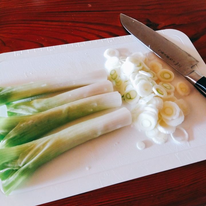 色々な料理に使いやすいのと、5歳の息子の食べやすさを考えて、長ネギは「小口切り」にしています。