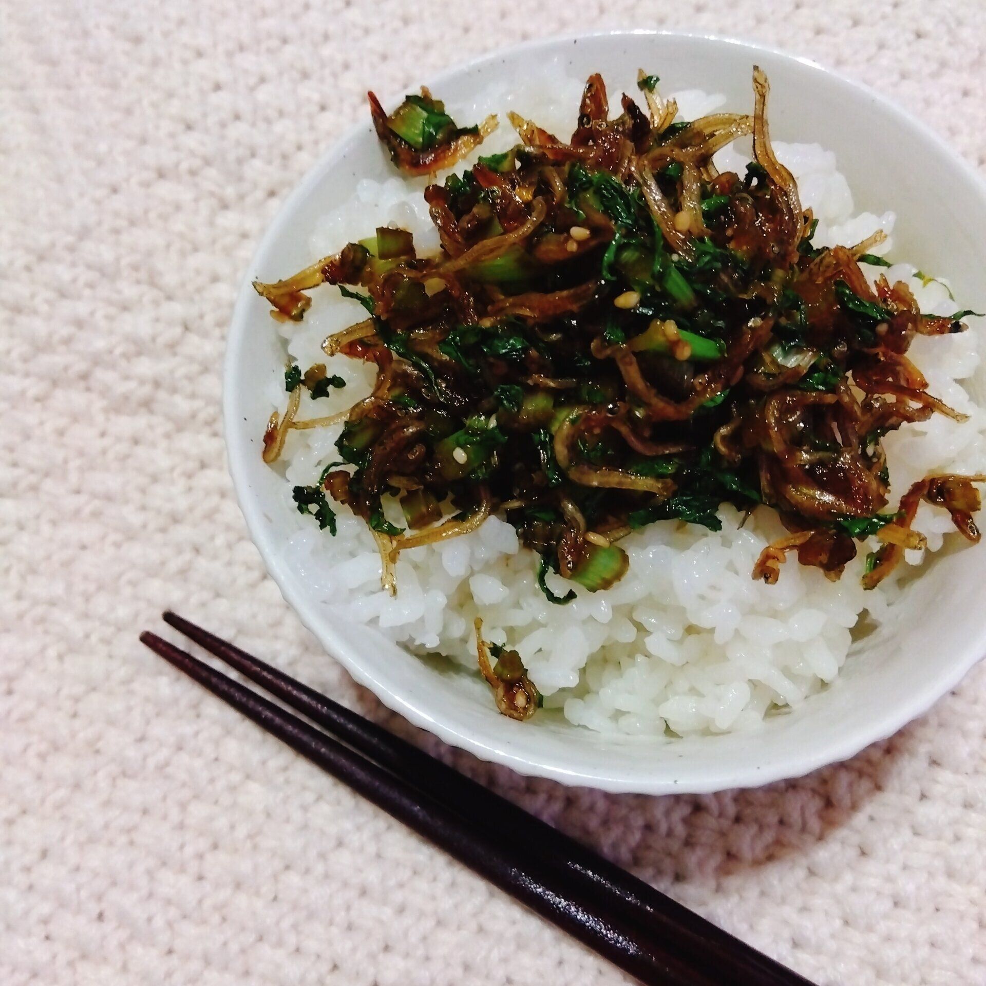 じゃこを、醤油大さじ1、砂糖大さじ1、みりん大さじ1、酒大さじ1で炒めた後に、小口切りにした大根の葉を炒めれば「だいこん葉ふりかけ」のできあがり。