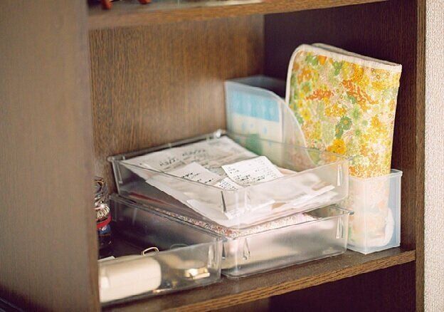 家族カードの支払い明細と内容を照らし合わせる為に、レシートでWチェック。リビングの棚にBOXを設置すれば夫も忘れずにレシートを入れられるので、もれなく管理できます。