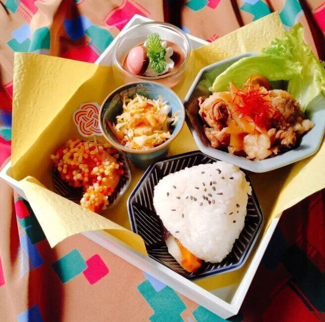 たとえば写真は、友人を家に招いたときのランチボックス。おにぎり、野菜サラダ、レトルトの牛丼など、どれも簡単なものですが、包装紙と小皿を使って「おもてなし感」をアップさせたことでこんなにゴージャスに!お客さんたちの歓声が聞こえてきそうですよね。また、普段の食事のときにも、重箱を大皿代わりにつかうことで、日々の食卓に特別感をプラス。「おうちごはん」は外食よりも断然安くつきますが、それをスペシャルなものにしてしまうアイデアです。