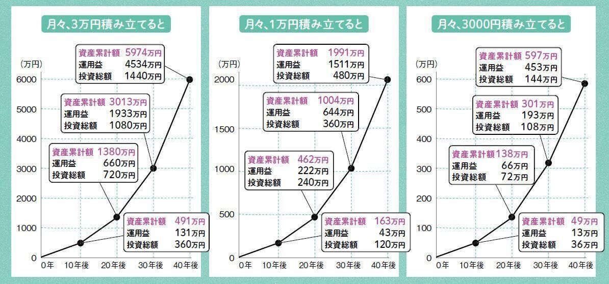 ムダな支出を減らせば、その分を投資に回すことができます。投資額が多いほど、あとで手にするお金が大きくなります。ムダ使いで消えていたお金が何倍にも殖える可能性も。
