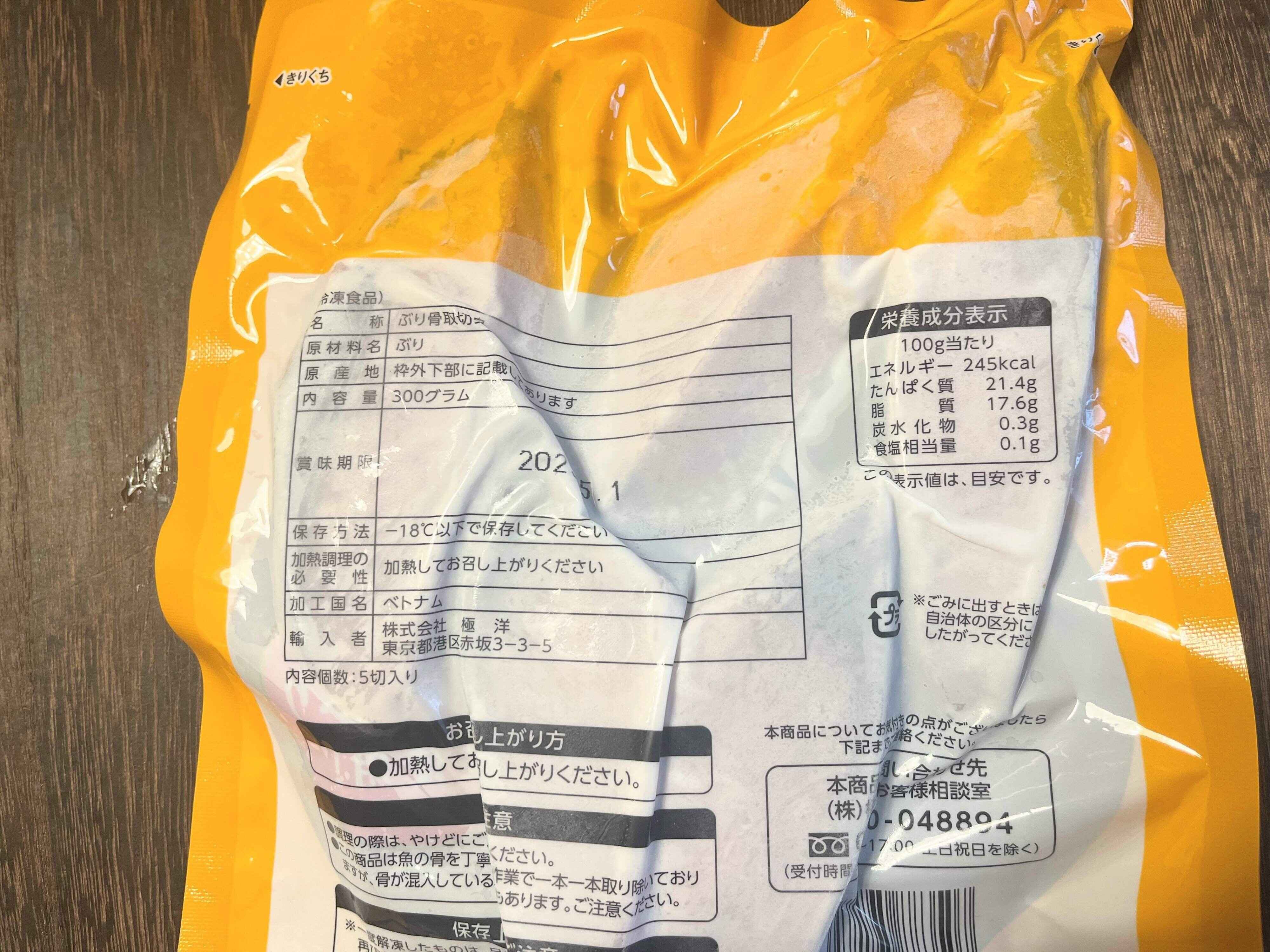 300g入りで、5切れ入りとなっています。骨が取り除かれているので、照り焼きなどはもちろん、煮魚にしても食べやすいので骨を嫌うお子さんにもうれしい商品!ぶり自体も脂がしっかりのっていて、冷凍の切り身魚ですがパサパサ感もありません。