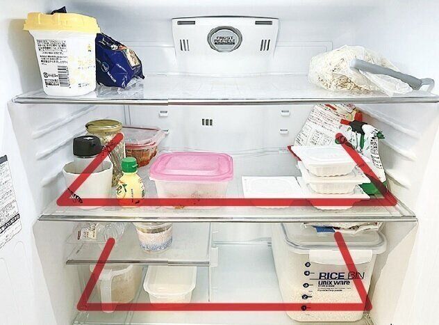 奥まで食材を詰め込むと、冷気の吹き出し口を塞ぎがち。食材を赤い線のように並べて、室内の冷気を循環することで電気代の節約に。
