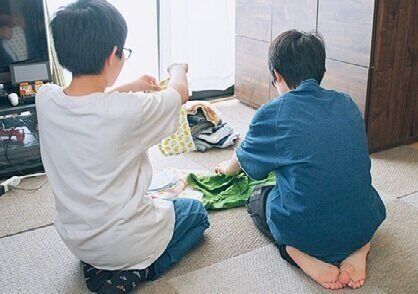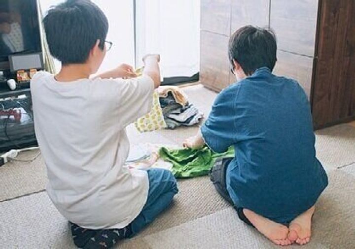 部屋は、多少散らかっていても不快でなければよしと割り切り。「毎日使う子どもの服やタオルは、畳んだらしまわずリビングに置きっぱなし。ここから勝手に取って使っていいことにしてます」。