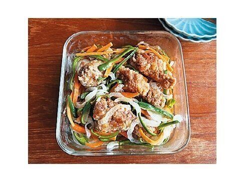 鶏肉のから揚げを野菜と一緒に南蛮漬けに。前日に漬けておけば味しみしみ。魚でもOK。