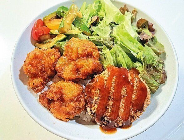 野菜系の副菜だけ前日に2日分作っておき、ご飯の上に冷凍の揚げものと一緒に盛りつければカフェ風どんぶりに! (せゆママさん)