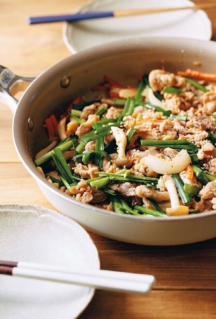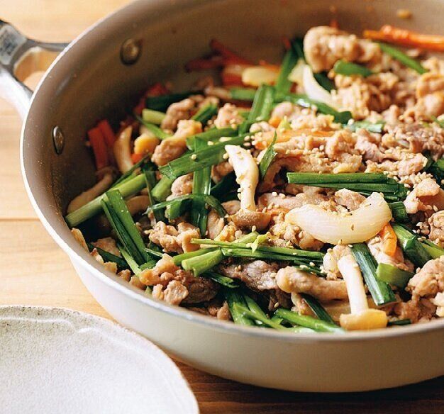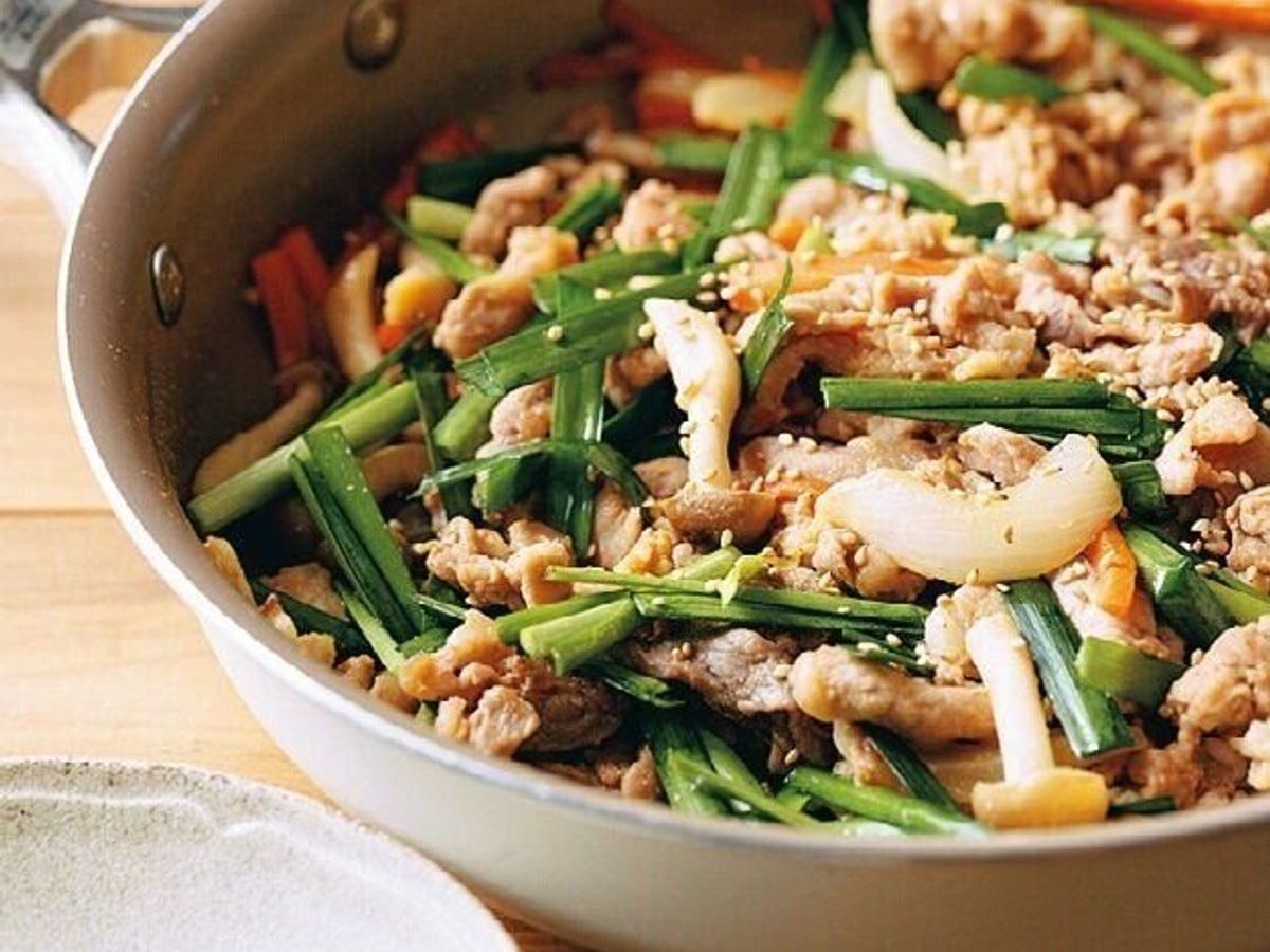 〈作り方〉ポリ袋に豚こま切れ肉400gを入れ、しょうゆ大さじ2 1/2 、砂糖、コチュジャン各大さじ1 1/2 、酒、みりん、ごま油各大さじ1、チューブにんにく小さじ1を加えてもみ込み、10分おく。細切りにした玉ねぎ1個、にんじん1/3本を炒め、豚肉としめじ30gを加えてさらに炒める。肉に火が通ったら幅3cmに切ったにら1/2束を加えてサッと炒め、白ごまをふる。