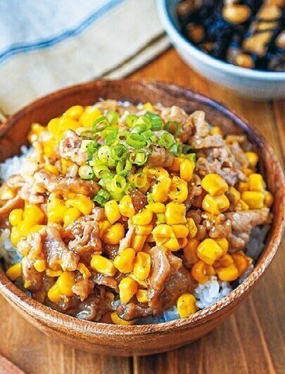 〈作り方〉ポリ袋に豚こま切れ肉250gを入れ、塩、こしょう各適量、片栗粉大さじ1をまぶす。豚肉とコーン180gを炒め、しょうゆ、みりん各大さじ1 1/2 、酒大さじ1、砂糖小さじ2、みそ小さじ1、チューブにんにく小さじ1/3を加えて炒める。バター10gを加えて溶けたら火を止め、ご飯にのせて刻んだねぎを散らす。