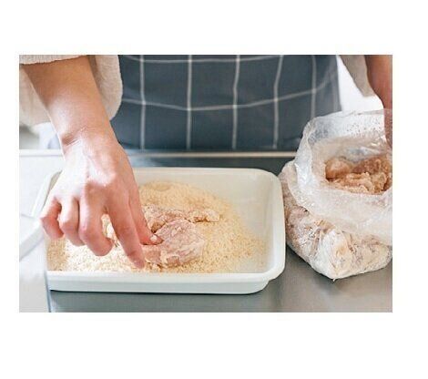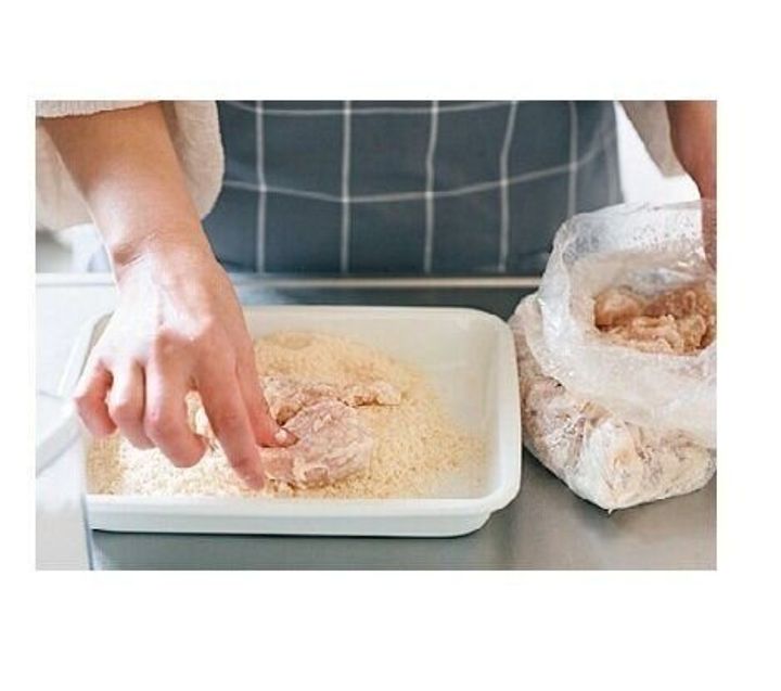 〈作り方〉食べやすく切った鶏胸肉400gをポリ袋に入れ、酒、マヨネーズ各大さじ1、しょうゆ、砂糖、顆粒鶏ガラスープの素各小さじ1、塩、チューブにんにく各小さじ1/2 を加えてもみ込み、15分おく。片栗粉大さじ3を加えてもみ込み、パン粉適量をつけて揚げ焼きにする。