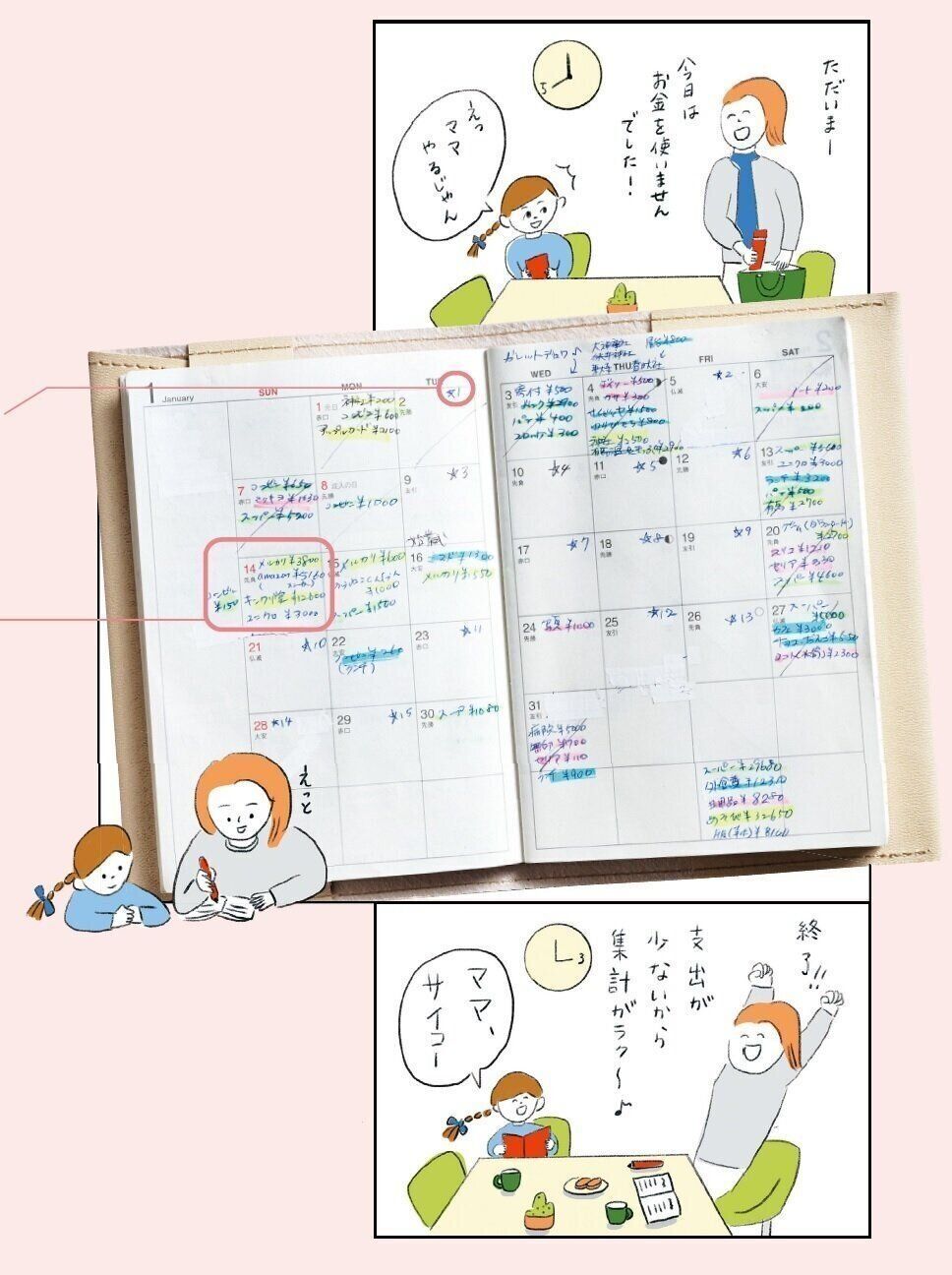 お金を使わなかった日は、手帳の日付に印をつける。頑張った証を目で見ると、自己肯定感が上がり、更に無駄な支出を減らしたくなる。