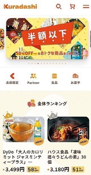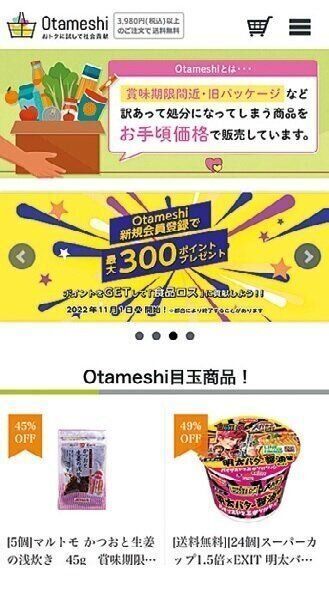 賞味期限が迫った食品やパッケージ変更などの商品を特価で販売。購入金額の1%が「Otameshiポイント」に加算され、1ポイント=1円で使える。PayPayなどのキャッシュレス決済も利用でき、1回の注文で3980円以上(税込み)の場合は送料が無料に。