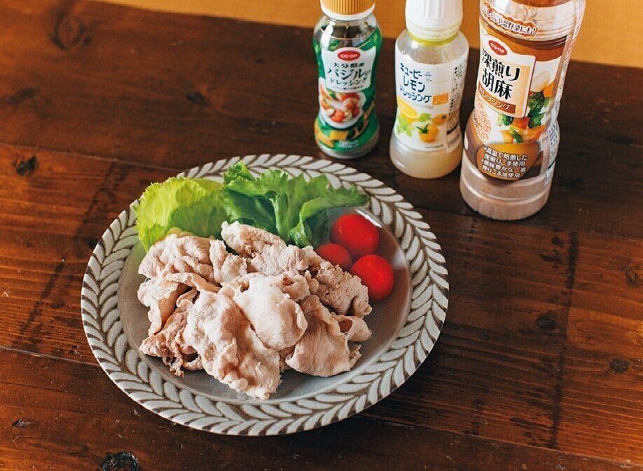 食材が少ないときや献立を思いつかないときも、ドレッシングがあれば、ゆでた肉にかけるだけでメインが完成。「赤と緑の食材を添えれば見た目も華やか。ドレッシングはサラダだけでなく、メインの味つけにも重宝します」。