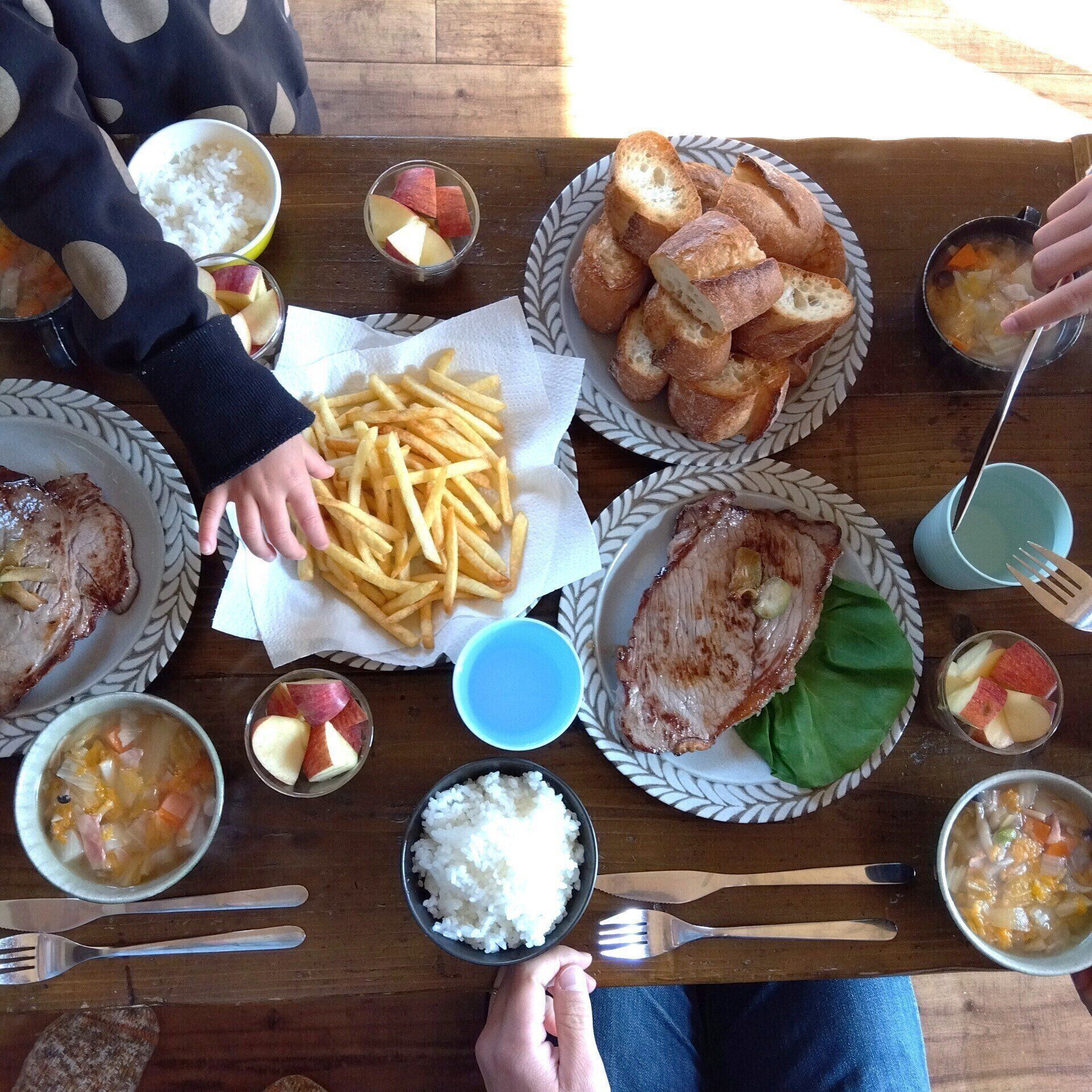 長女好みにぶ厚くカットして、しっかり目にリベイク。口の中をケガしそうなほどに、カリッカリに焼けたフランスパンを食べながら「噛めば噛むほどおいしいの」と、ふだんクールな長女がフランスパンの推しポイントを熱く語る様子に、母も大満足。