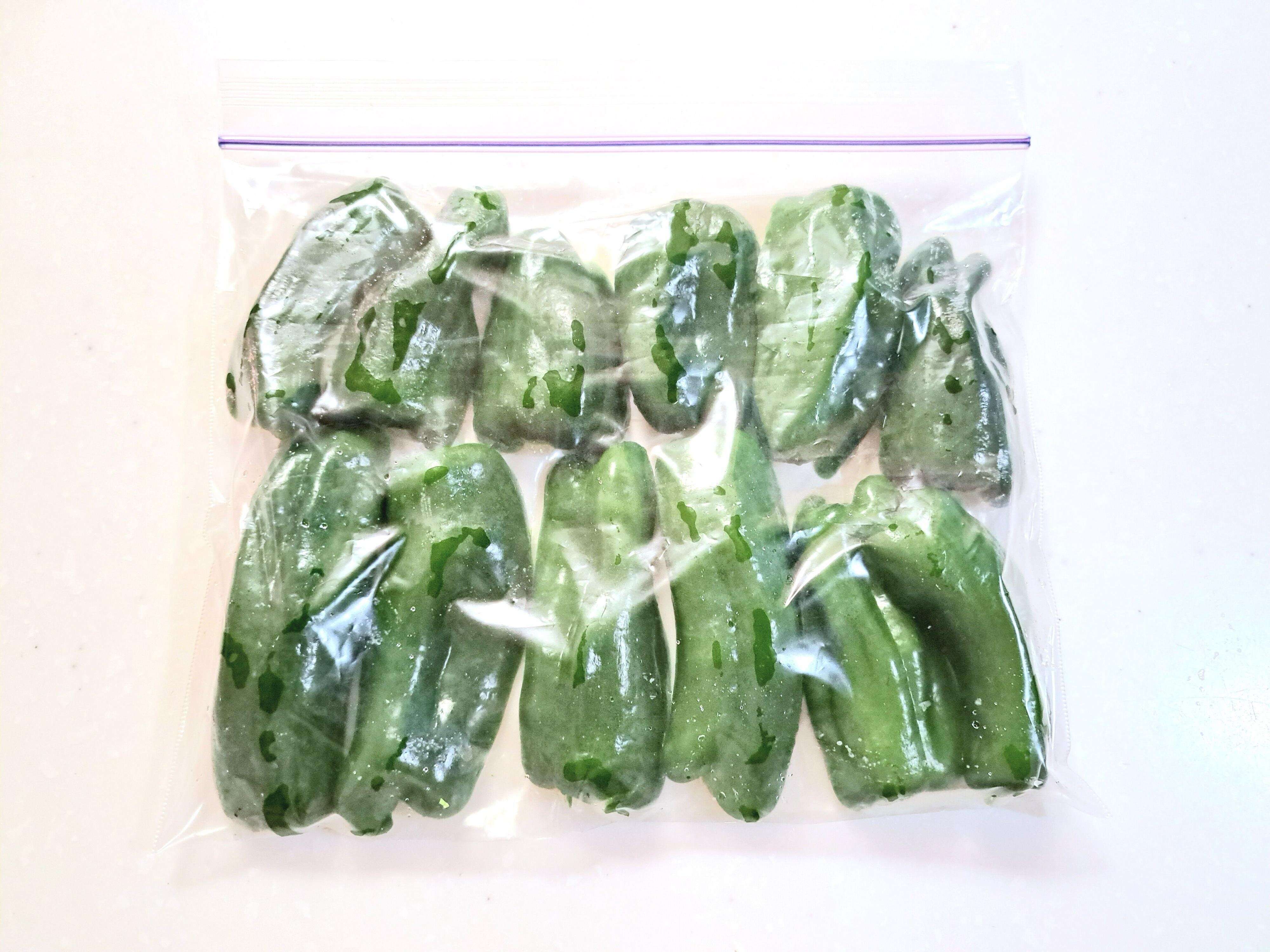 ピーマンは半分にカットしてから冷凍しています。そのほうが使い道に制限されなくて便利だからです。