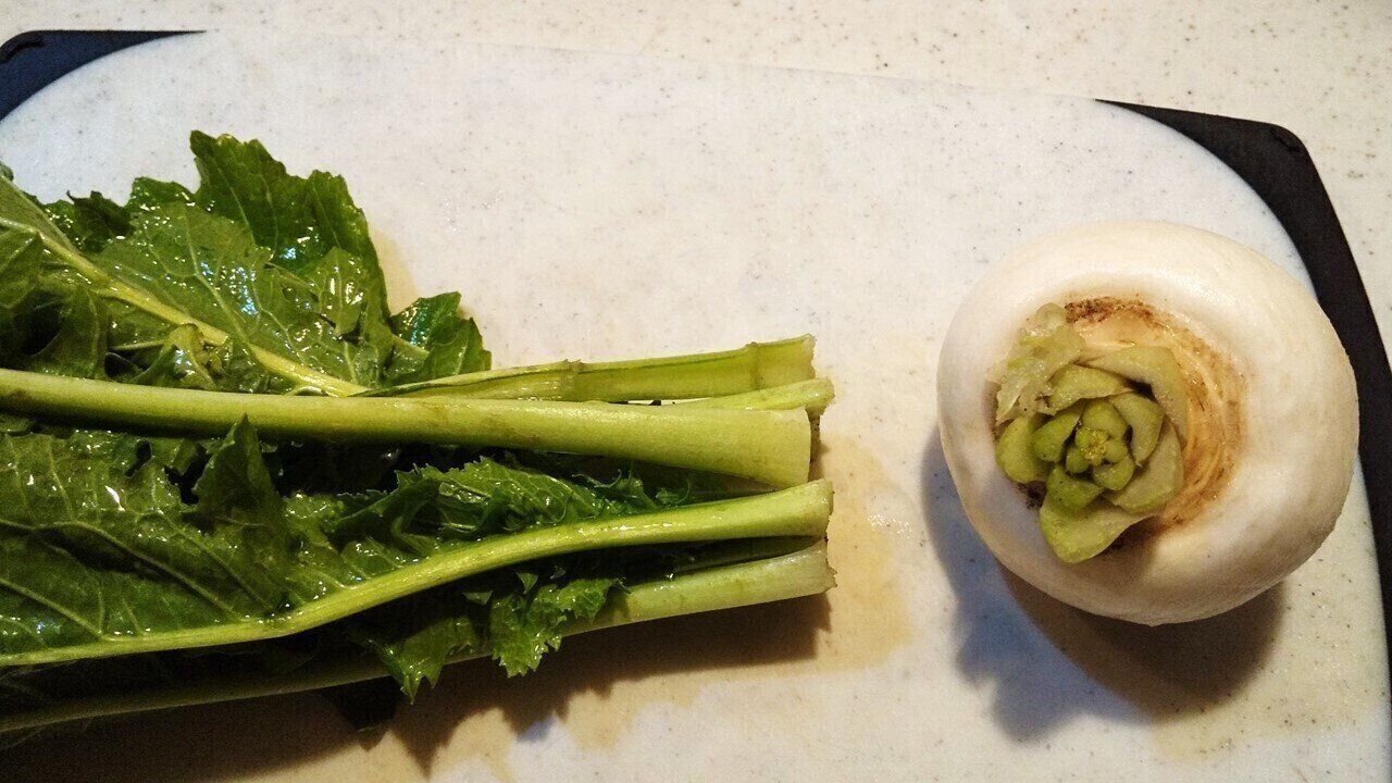 1.かぶ(根)は洗って皮ごと薄く切る。かぶ(葉)は洗って水気を切り、細かく刻む。