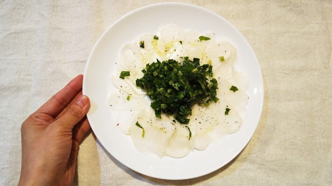 筆者は、葉付きのかぶを見つけるといつもつくるのが「カルパッチョ風サラダ」です。