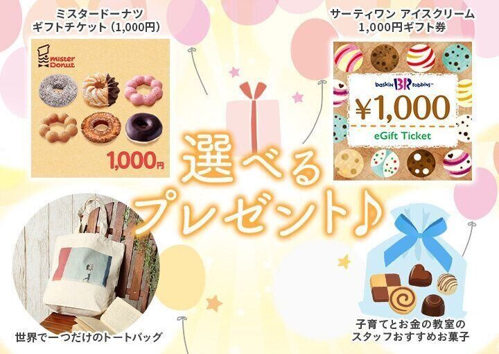 5月・6月は、ミスタードーナツ ギフトチケット、サーティワン アイスクリーム、好きな写真をプリントできる世界でひとつだけのトートバッグ、子育てとお金の教室のママスタッフおすすめのお菓子から選べます。