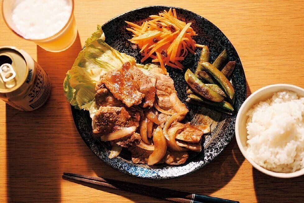 生協ではアプリに登録した物だけを、スーパーでは肉、魚、野菜、大豆食品などの定番食材を購入。献立は焼いた肉か魚と副菜でOK。時間がある日は副菜を2~3種類作りおきすることも。