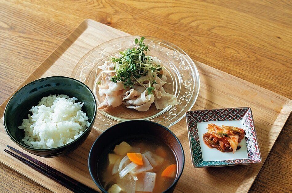 疲れて帰ってきても自炊が続くよう、ふだんの夕食は省エネに。「子どもが野菜を取れる具だくさんの豚汁と、簡単なメインのみ。副菜はキムチなど“出すだけの物でよし」。