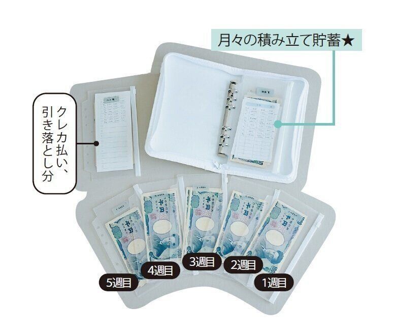 やりくり費はトータルで管理し、週ごとに袋分け。お出かけ予定に合わせて週予算を調整したり、クレカで払ったら現金を取り分けたりすることで、使えるお金を見える化。ムダがゼロに!