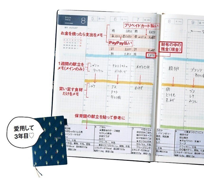 「ほぼ日手帳(カズン)」のウィークリーページの上段に、出費した金額や内容を記入。「特に予算を守りたい食費は、1週間分の献立や買うものを先にメモ。買いすぎを防ぐのに役立ってます」。