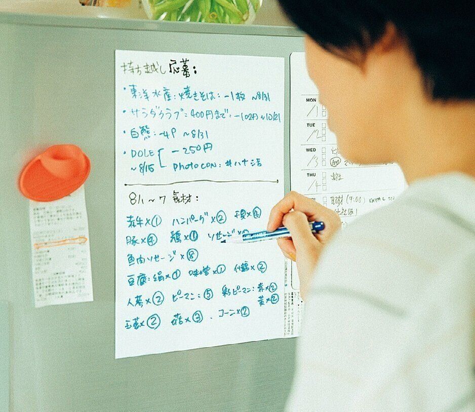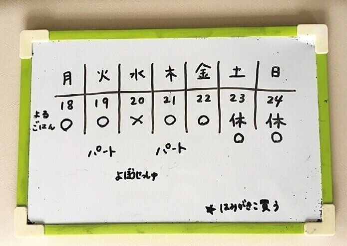 冷蔵庫の横に貼っておき、妻のパートの予定を書いたり、ときには買い物メモとして使うことも。夫の夕食がいらない日にバツ印をつけておけば、料理の作りすぎや食材の買いすぎを防げ、食材ロスもイライラもなし!
