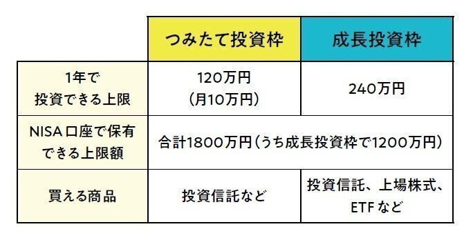 新NISAを利用すれば、つみたて投資枠と成長投資枠を合わせて、年間360万円までの投資で得た利益から税金が引かれません。さらに1800万円まで投資元本の保有OK。成長投資枠では、投資信託のほかにも上場株式やETF(上場投資信託)の購入も可。