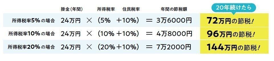 所得税は、所得が多くなるに従って税率が段階的に高くなります。同じ「年24万円」の掛金でも、税率20%の人は住民税を含めて、税率5%の人よりも2倍の金額が節税できます。1年間でこの差なので、10年、20年続けると節税効果の差はますます大きく。