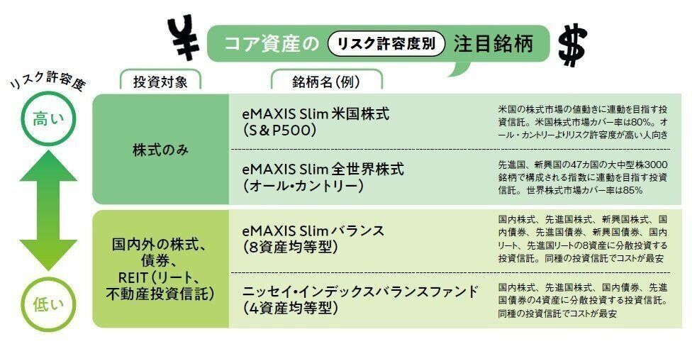 米国株式市場にのみ投資しているS&P500は、米国企業の株価が急落した場合、オール・カントリーよりも大きなダメージを受けるので、リスク許容度がやや高い人向き。一方、株式だけではなく債券やリートなどに分散投資しているバランス型の投資信託は、値動きがマイルド。安定成長を目指すコア資産に向いている投資商品と言えるでしょう。