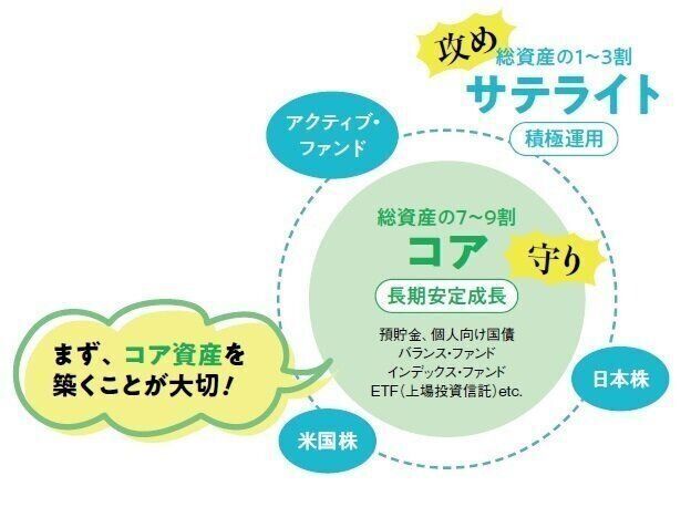 「コア・サテライト」とは、お金を減らさずに殖やすことを目指す投資戦略のこと。資産の7~9割はインデックス・ファンドなどで堅実に殖やす「コア資産」として、残りの1~3割は個別株などリスクは高いけど大きなリターンが期待できる「サテライト資産」として保有するという戦略。まずはコア資産を固めましょう。