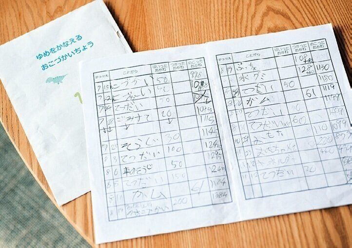 小1からお手伝いをしたら小遣いをもらえるシステムに。「小遣いを貯めると欲しい物が買えること、買うと貯めたお金が減ることを子どもに体験してほしいですね」。